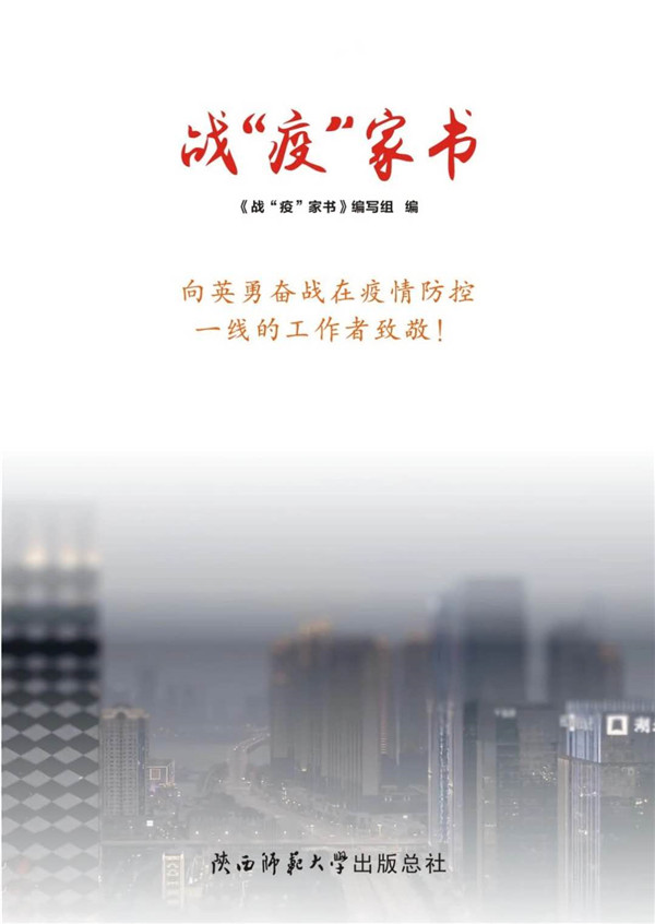 陜西師大出版總社積極響應(yīng)、主動(dòng)作為,全國(guó)首推《戰(zhàn)“疫”家書》一書,用文字和圖片生動(dòng)記錄了一封封戰(zhàn)“疫”家書,講述抗疫一線的感人事跡,訴說著“白衣戰(zhàn)士”等平凡英雄內(nèi)心深處的真情與大愛。微信短信,手機(jī)里有字里行間的情感流露,見字如面,紙短情長(zhǎng)。家書中,有難舍的牽掛,有家人的囑托,有醫(yī)務(wù)工作者“健康所系,性命相托”的莊嚴(yán)承諾,更有用無(wú)比的勇氣和斗志奔赴抗疫戰(zhàn)場(chǎng)的家國(guó)情懷。