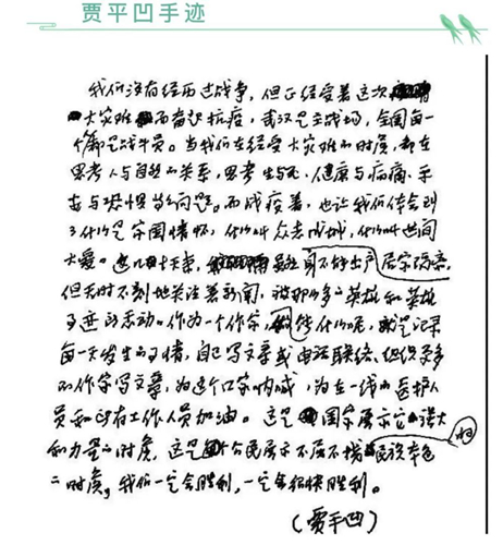 3月5日,著名作家賈平凹接受新華每日電訊草地副刊專訪時表示,此次邀請全國知名作家撰稿參與《共同戰(zhàn)“疫”》,就是要用作家的視角,以記錄的形式“抒寫抗擊疫情中平凡人的不平凡,以及引發(fā)的深刻思考”。