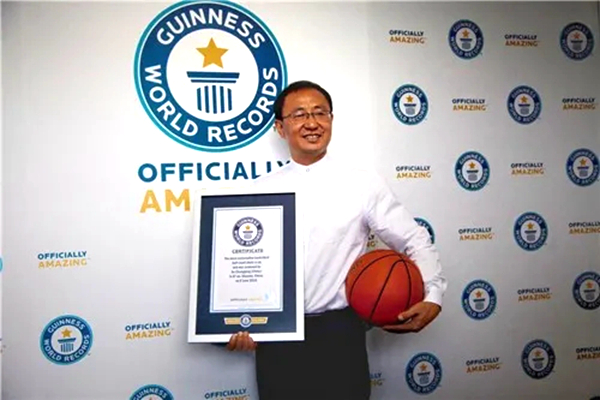 (徐長(zhǎng)清2016年打破半場(chǎng)超遠(yuǎn)投籃六連中吉尼斯世界紀(jì)錄時(shí)領(lǐng)獎(jiǎng)留影 攝影 姚建宇)