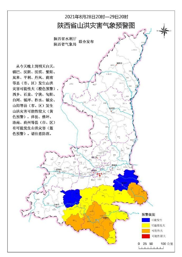 陜西省水利廳與陜西省氣象局聯(lián)合發(fā)布山洪災(zāi)害氣象預(yù)警:預(yù)計2021年8月28日20時至2021年8月29日20時,鎮(zhèn)巴、漢陰、漢濱、紫陽、嵐皋、平利、丹鳳、商南等縣(市、區(qū))發(fā)生山洪災(zāi)害可能性大(橙色預(yù)警),西鄉(xiāng)、石泉、寧陜、旬陽、白河、鎮(zhèn)坪、柞水、鎮(zhèn)安、山陽等縣(市、區(qū))發(fā)生山洪災(zāi)害可能性大(黃色預(yù)警),洋縣、佛坪、洛南、商州等縣(市、區(qū))有可能發(fā)生山洪災(zāi)害(藍(lán)色預(yù)警)。請注意防范。