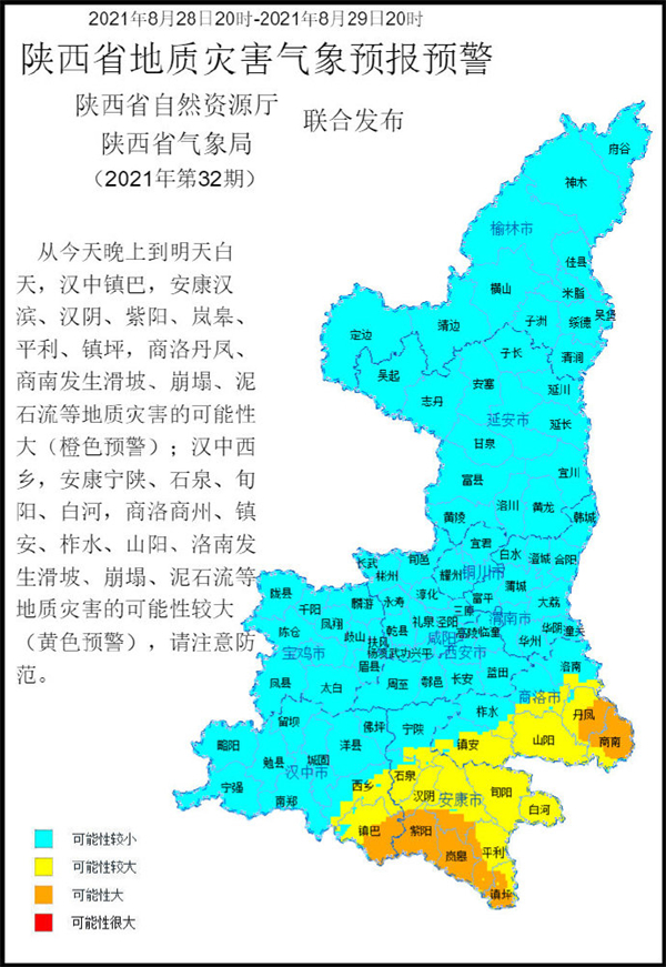 陜西省自然資源廳與陜西省氣象局聯(lián)合發(fā)布地質(zhì)災(zāi)害氣象預(yù)報預(yù)警:預(yù)計2021年8月28日20時至2021年8月29日20時,漢中鎮(zhèn)巴,安康漢濱、漢陰、紫陽、嵐皋、平利、鎮(zhèn)坪,商洛丹鳳、商南發(fā)生滑坡、崩塌、泥石流等地質(zhì)災(zāi)害的可能性較大(橙色預(yù)警);漢中西鄉(xiāng),安康寧陜、石泉、旬陽、白河,商洛商州、鎮(zhèn)安、柞水、山陽、洛南發(fā)生滑坡、崩塌、泥石流等地質(zhì)災(zāi)害的可能性較大(黃色預(yù)警),請注意防范。