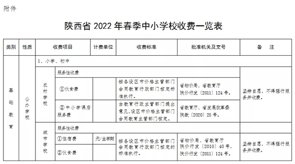附件:陜西省2022年春季中小學(xué)校收費(fèi)一覽表