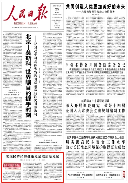 3月25日,《人民日報》頭版刊發(fā)文章《實現(xiàn)民營經(jīng)濟(jì)健康發(fā)展高質(zhì)量發(fā)展(新時代新征程新偉業(yè)·堅定不移推動高質(zhì)量發(fā)展)》,其中聚焦陜西民營經(jīng)濟(jì)發(fā)展。