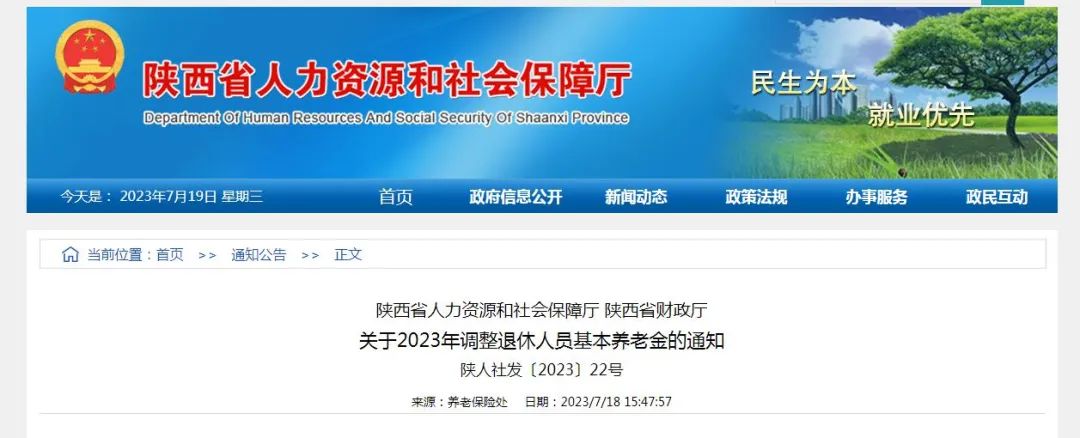 7月18日,陜西省人社廳在官網(wǎng)發(fā)布《關(guān)于2023年調(diào)整退休人員基本養(yǎng)老金的通知》(下簡稱《通知》),通知提到,退休人員每人每月增加40元,從2023年1月1日起執(zhí)行。