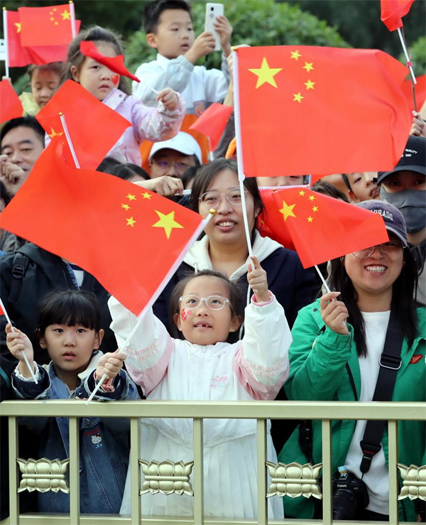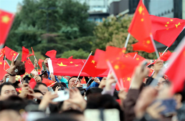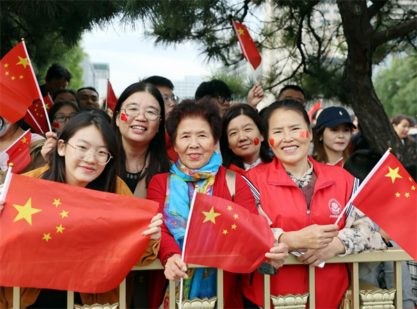 隨后,在《歌唱祖國》的奏樂中,人們揮舞著手中的國旗,盡情唱響愛國贊歌,表達(dá)愛國之情。