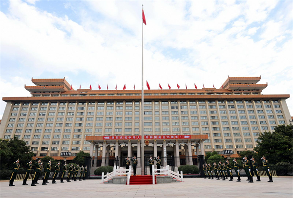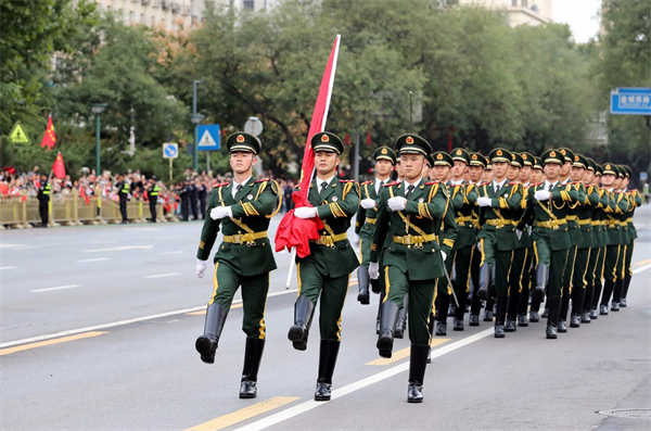 國旗護(hù)衛(wèi)隊隊員邁著鏗鏘有力的步伐,護(hù)送國旗至升旗臺。