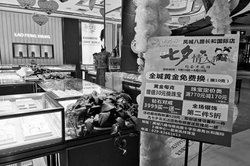 商場(chǎng)里一些商家打出﹃七夕﹄活動(dòng)廣告 有人將七夕稱為中國(guó)的情人節(jié)。一年一度的農(nóng)歷七夕將至,西安街頭也被濃濃的甜蜜氣氛包圍。與此同時(shí),節(jié)日所帶動(dòng)的“浪漫……