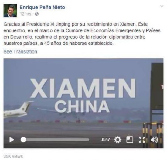 墨西哥總統(tǒng)培尼亞參加了5日召開的新興市場國家與發(fā)展中國家對話會,商討“金磚+”合作。他在臉譜賬號上發(fā)文說:“感謝習(xí)近平主席在廈門的款待。在新興市場國家與發(fā)展中國家對話會期間(與習(xí)主席)的會晤,在(墨中)建交45周年之際,加深了我們兩國之間的外交關(guān)系。”