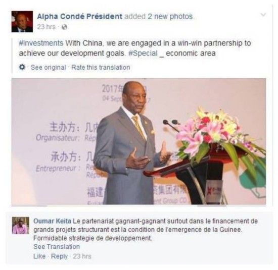 年近八旬的幾內(nèi)亞總統(tǒng)孔戴也在臉譜上記錄下自己的中國之行。他在一條貼文中寫道:“我們與中國開展雙贏合作,以實現(xiàn)我們的發(fā)展目標(biāo)”。