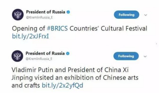 克里姆林宮推特官方賬號則發(fā)了兩條關(guān)于俄羅斯總統(tǒng)普京出席文化交流活動的推文,分別是普京參加金磚國家文化節(jié)和中國藝術(shù)品展。人文交流是此次廈門會晤上推進(jìn)金磚合作的一大新支柱。