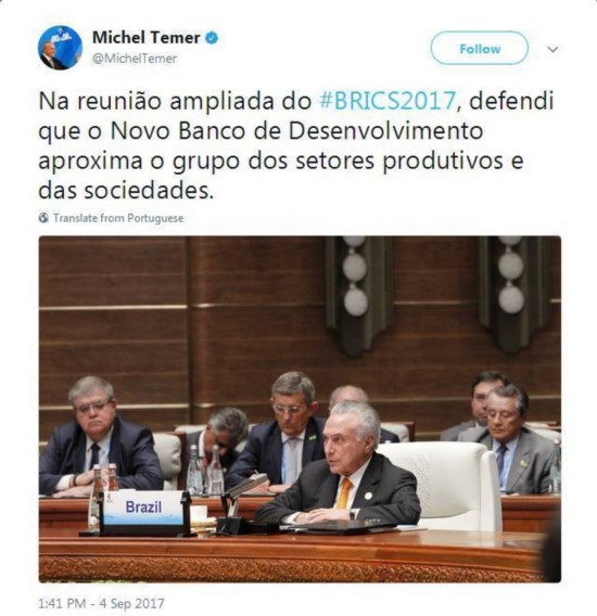 在其中一條推文中,特梅爾對新成立不久的金磚國家新開發(fā)銀行充滿期待。他說自己在4日的金磚國家領(lǐng)導(dǎo)人廈門會晤大范圍會議中呼吁新開發(fā)銀行把生產(chǎn)部門和社會更緊密地聯(lián)結(jié)在一起。