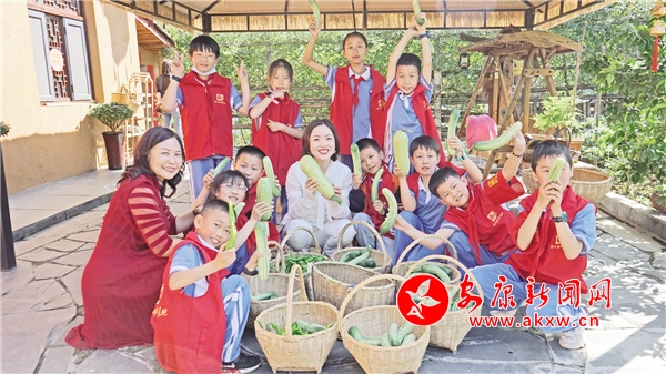 (學(xué)生在老師的帶領(lǐng)下學(xué)會辯別采摘蔬菜。)