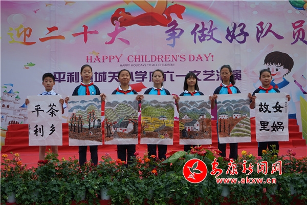 “六一”當(dāng)天,一幅幅色彩明快、稚趣盎然的書畫作品,或懸掛樹上,或靠立舞臺前,或豎立在操場四周,把文藝匯演現(xiàn)場裝扮得十分美觀。書畫展吸引了一群群學(xué)生進行觀看、欣賞,贊嘆聲不絕。
